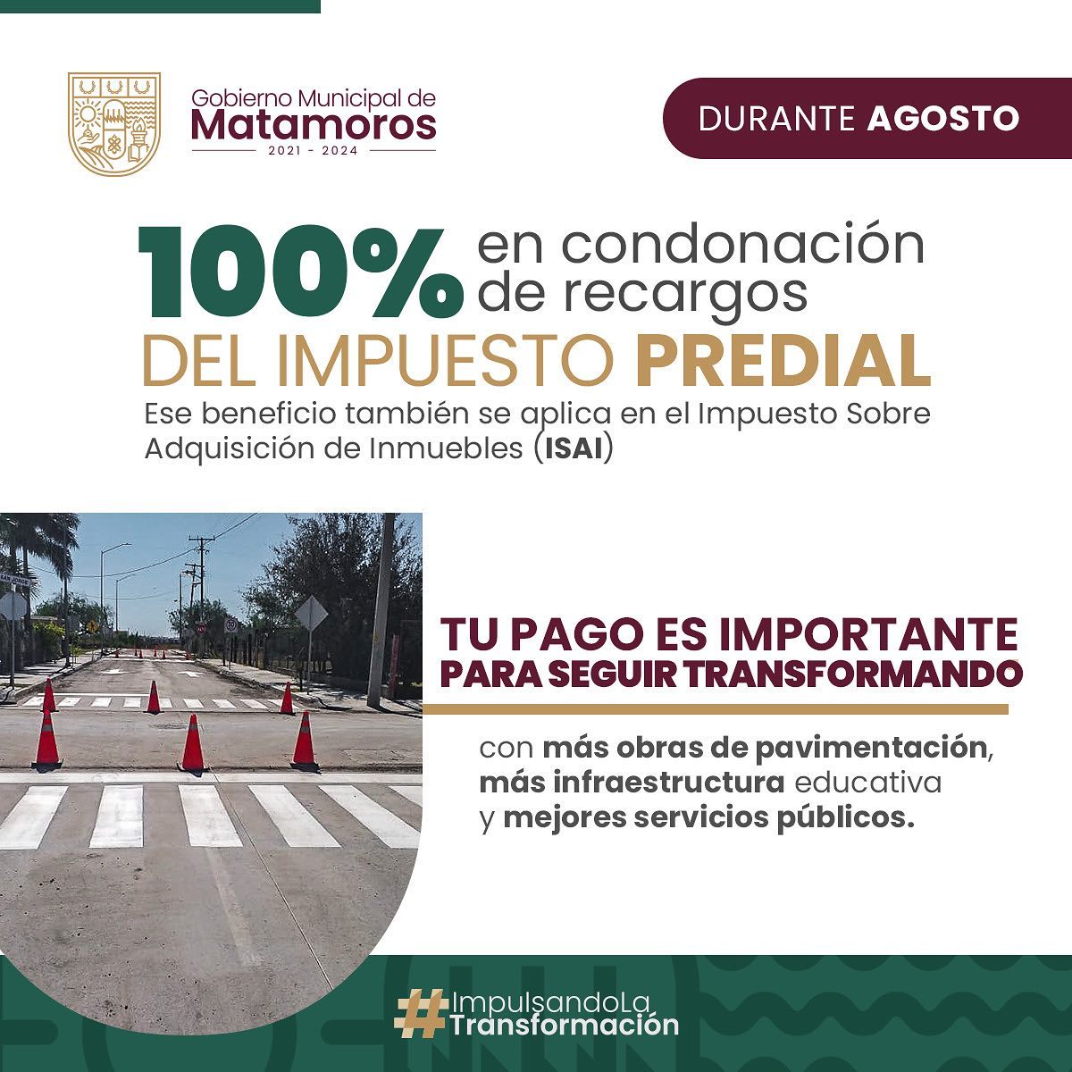 El Gobierno Municipal de Matamoros te recuerda que todo el mes de agosto se tendrá descuento del 100% en los recargos del impuesto predial e ISAI. Acude de lunes a viernes de 8 de la mañana a 4 de la tarde a las oficinas de la presidencia municipal