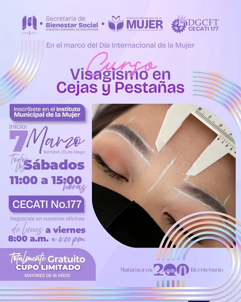 El Gobierno de Matamoros, encabezado por el alcalde Beto Granados, a través del Instituto Municipal de la Mujer, invita a la ciudadanía a participar en el Curso de Visagismo en Cejas y Pestañas, una capacitación práctica enfocada en el diseño y realce de cejas y pestañas de acuerdo con el tipo de rostro, impulsando habilidades que pueden convertirse en una fuente de autoempleo.