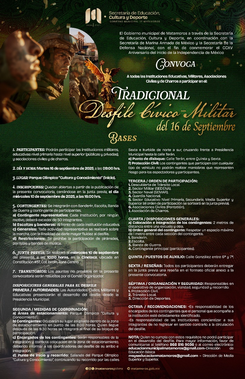 NOTA: Quien no cumpla con estos requisitos no podrá participar en el desarrollo del desfile. Para mayor información, favor de comunicarse al teléfono 868 816 9036 o al correo electrónico: educacionmunicipalmatamoros@gmail.com – Dirección de Educación Básica