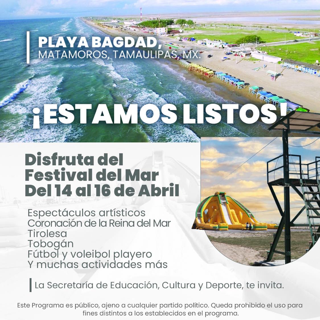 La Secretaría de Educación, Cultura y Deporte te invita a disfrutar del Festival del Mar a realizarse en Playa Bagdad del 14 al 16 de Abril del presente año donde se llevarán a cabo espectáculos artísticos, torneos deportivos, tirolesa, tobogán y la Coronación de la Reina del Mar.