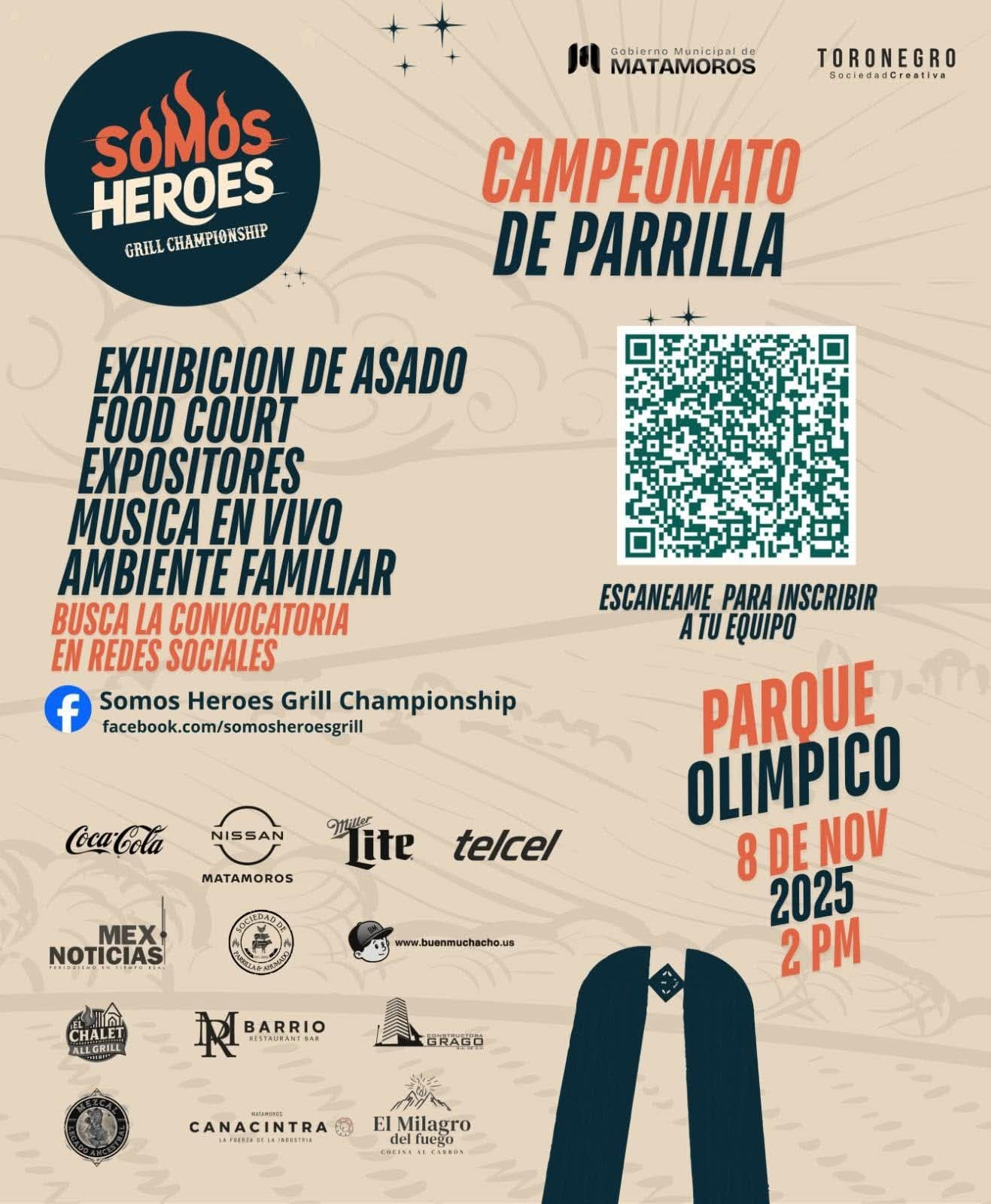 El Gobierno de Beto Granados invita a la ciudadanía a disfrutar del Campeonato de Parrilla “Somos Héroes Grill Championship”, un evento que reunirá a los mejores equipos parrilleros en un ambiente familiar lleno de sabor, música y diversión. La cita es el 8 de noviembre de 2025, a partir de las 2:00 de la tarde, en el Parque Olímpico.