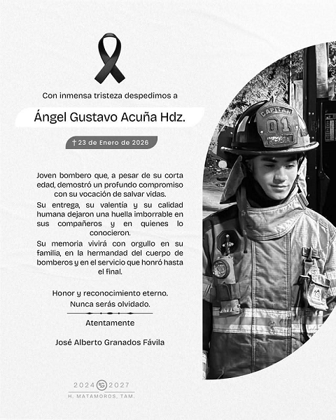 El alcalde de Matamoros, Beto Granados, expresó su más profundo pesar por el fallecimiento del joven bombero Ángel Gustavo Acuña Hernández, ocurrido este 23 de enero de 2026, lamentando una pérdida que enluta no solo a su familia, sino a toda la comunidad y al Heroico Cuerpo de Bomberos. Con inmensa tristeza, el edil reconoció que se va un servidor público que, pese a su corta edad, demostró un compromiso ejemplar con la noble vocación de salvar vidas.