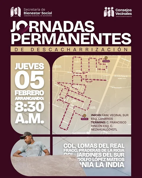 Este jueves, las jornadas permanentes de descacharrización estarán recorriendo las colonias Lomas del Real, Jardines del Sur, Adolfo López Mateos, La India y el fraccionamiento Praderas de las Rojas, sectores que se suman a las decenas de colonias que ya han sido beneficiadas con este programa municipal.