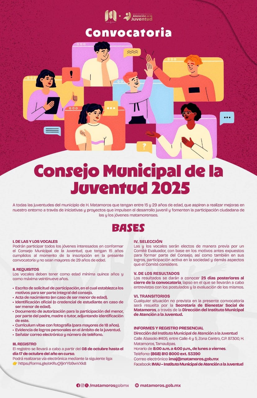 El Consejo Municipal de la Juventud 2025 abre su convocatoria para jóvenes de 15 a 29 años que deseen ser parte de un espacio de participación, diálogo y acción orientado al desarrollo de Matamoros.