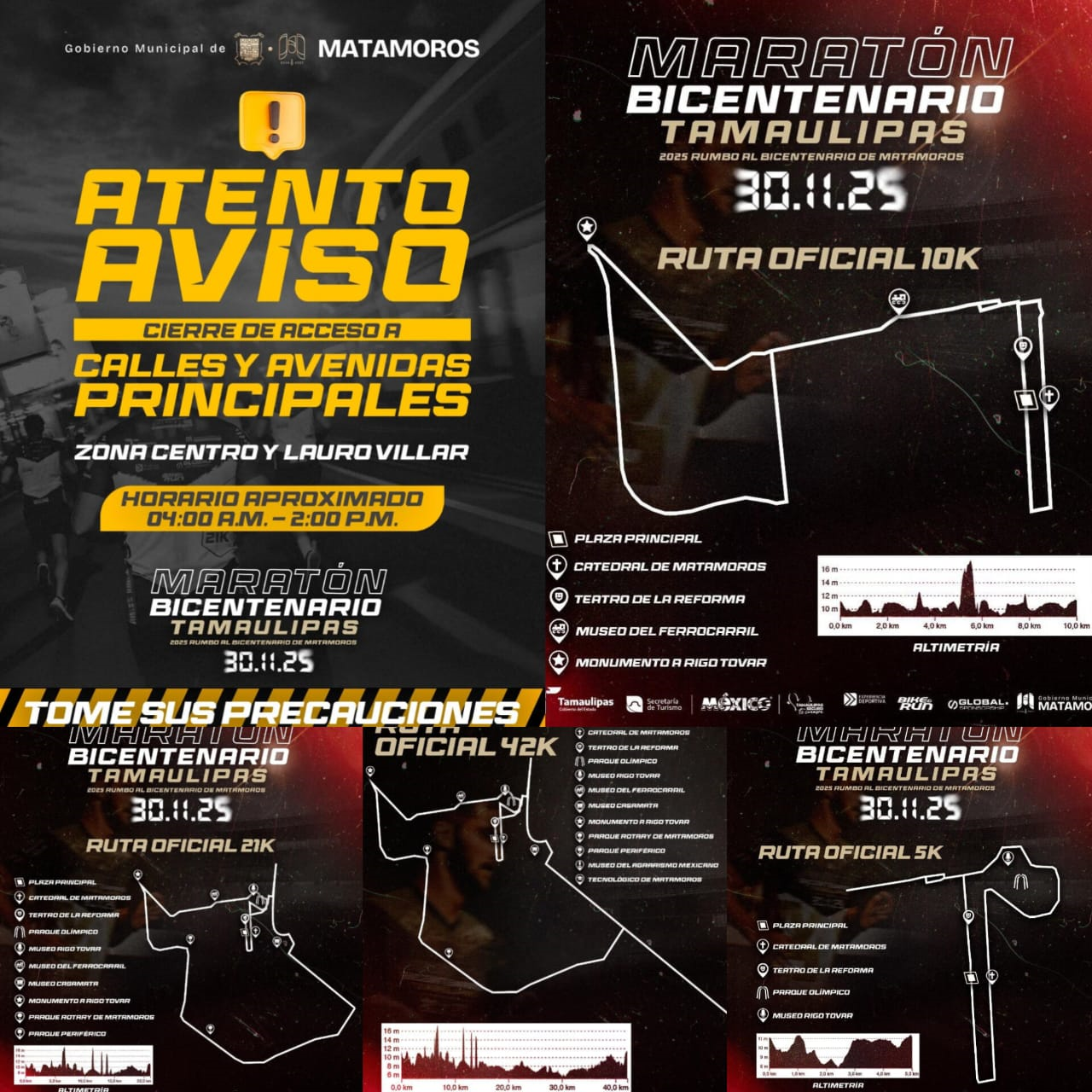 El Gobierno Municipal que encabeza Beto Granados informó que este próximo domingo 30 de noviembre diversas vialidades de Matamoros formarán parte del recorrido del Maratón Rumbo al Bicentenario 2025, por lo que se implementarán cierres temporales en calles de la Zona Centro Centro y Av. Lauro Villar.