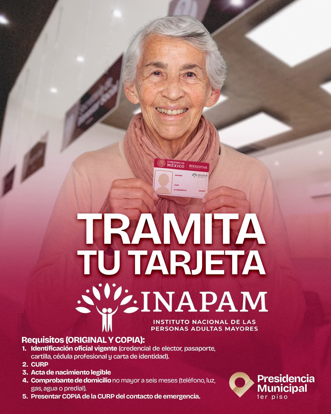 El Gobierno de Matamoros informa a la población adulta mayor de 60 años en adelante que ya se encuentra disponible el trámite para obtener la tarjeta INAPAM, un documento que brinda acceso a importantes descuentos y beneficios en todo el país.