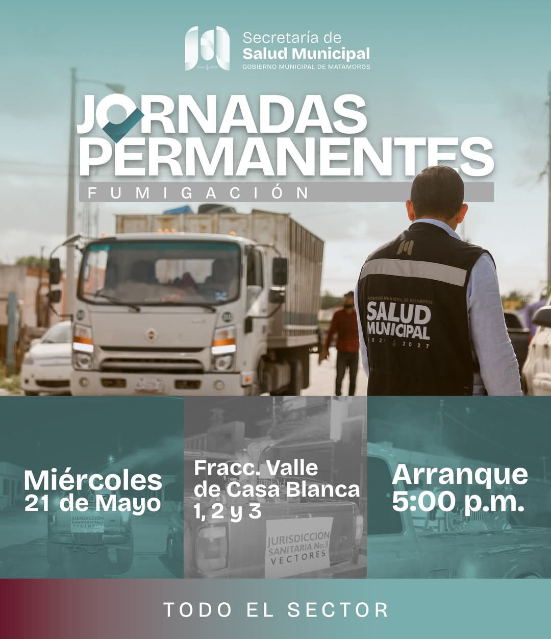 El Gobierno de Matamoros, bajo la presidencia de Beto Granados, ha anunciado que este miércoles 21 de mayo, las Jornadas Permanentes de Fumigación se llevarán a cabo en el Fraccionamiento Valle de Casa Blanca 1, 2 y 3, iniciando a las 17:00 horas. Esta iniciativa forma parte de las estrategias implementadas por la administración municipal para garantizar la salud y bienestar de los ciudadanos.