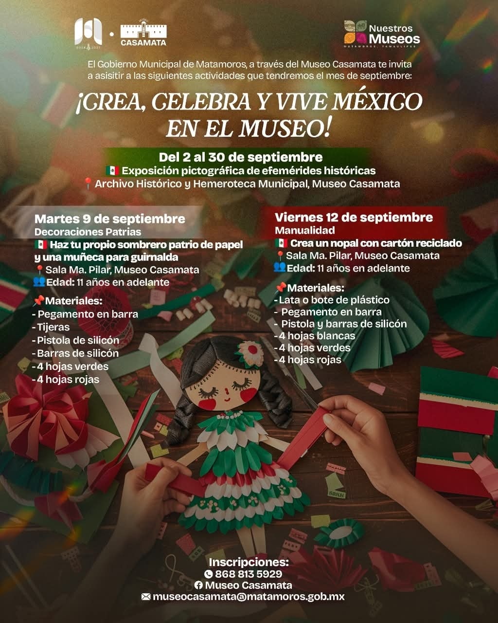 El Gobierno de Matamoros, que preside el alcalde Beto Granados y el Museo Casamata invitan a la ciudadanía a participar en las actividades programadas durante septiembre, mes en el que celebramos con orgullo nuestras tradiciones mexicanas.