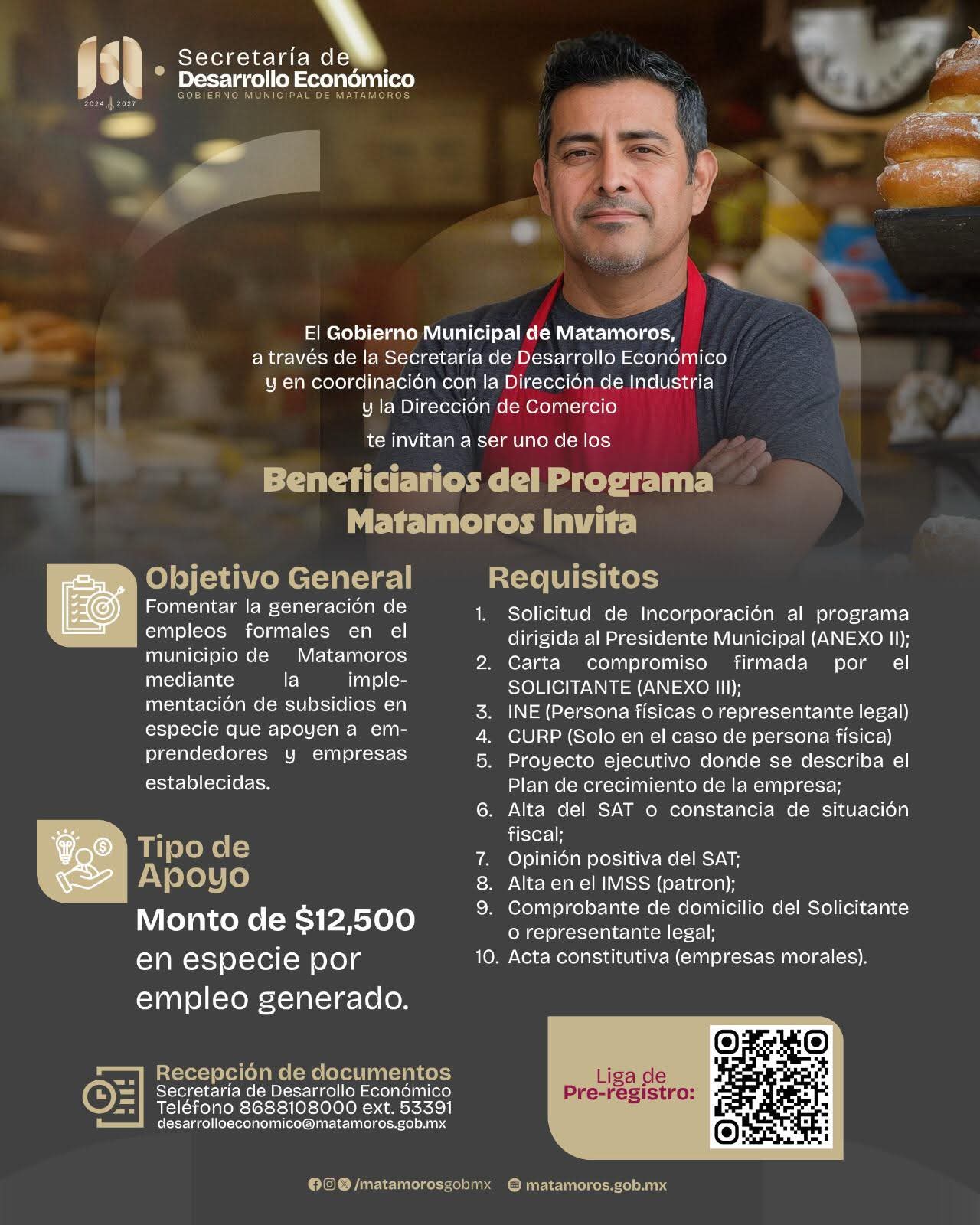 El Gobierno Municipal que preside el alcalde, Beto Granados, invita a emprendedores y empresarios a participar en el programa “Matamoros Invita”, diseñado para impulsar el crecimiento de los negocios locales.