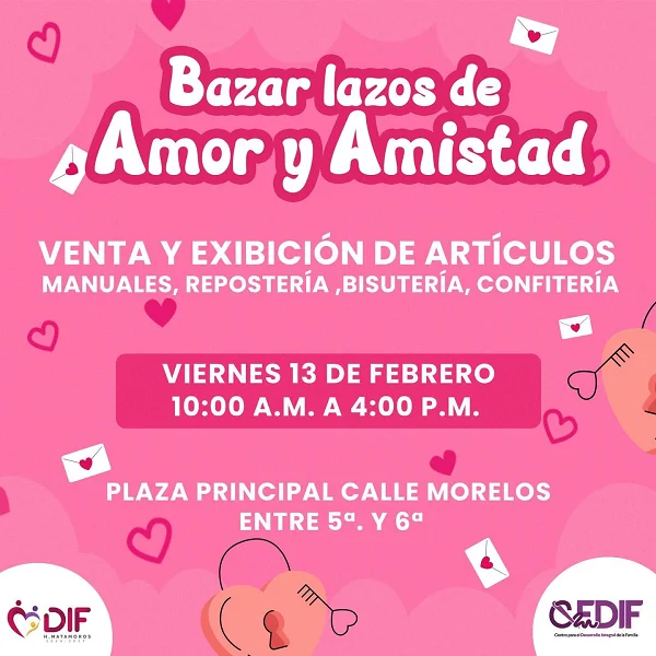 En el marco de las celebraciones por el Día del Amor y la Amistad, el Sistema DIF Matamoros invita a la ciudadanía a asistir al “Bazar Lazos de Amor y Amistad”, un evento que busca resaltar el trabajo artesanal y el talento de quienes integran los centros de capacitación del organismo.