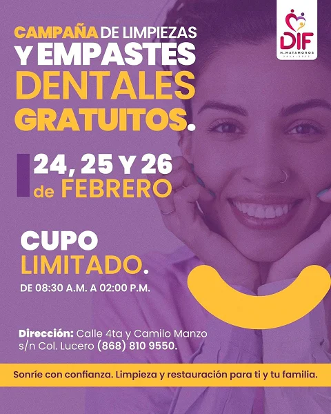 El Sistema DIF Matamoros, a través del Departamento de Dental, convoca a la ciudadanía a participar en la Campaña de Limpieza y Empastes Dentales, con el objetivo de promover el acceso servicios de atención y cuidado bucal de calidad.