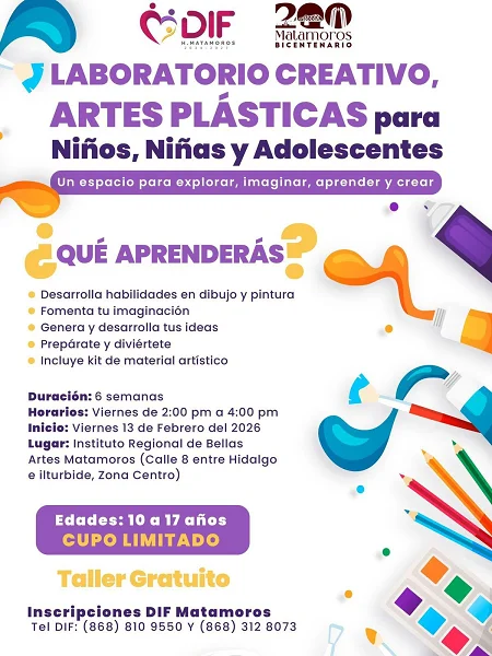 El Sistema DIF Matamoros a través del programa Atención a la Familia, invita a niñas, niños y adolescentes de 10 a 17 años, a formar parte del Taller “Laboratorio Creativo”, un espacio dedicado a explotar la creatividad y fomentar la imaginación de los más pequeños mediante las artes plásticas.