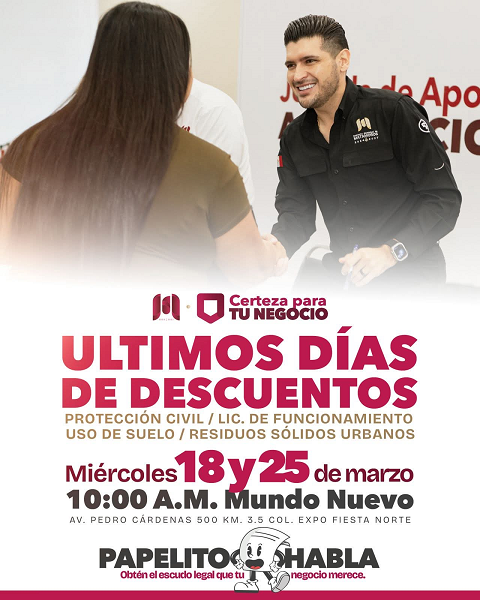 📄 En apoyo al sector comercial de Matamoros, continúan las jornadas “Certeza para tu Negocio”, un espacio pensado para que emprendedores, pequeños y medianos negocios, así como empresas, puedan ponerse en regla de manera accesible, con asesoría directa y aprovechando descuentos.