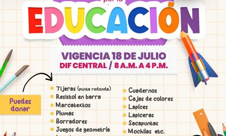 Esta campaña, invita a los ciudadanos a donar útiles escolares nuevos, tales como cuadernos, lápices, colores, mochilas, loncheras, plumas, borradores, sacapuntas y juegos de geometría. Las donaciones pueden entregarse en las instalaciones del Sistema DIF, ubicada en la calle 4ta. y Camilo Manzo, en horario de 8:00 de la mañana a 4:00 de la tarde, teniendo como fecha límite hasta el 18 de julio.