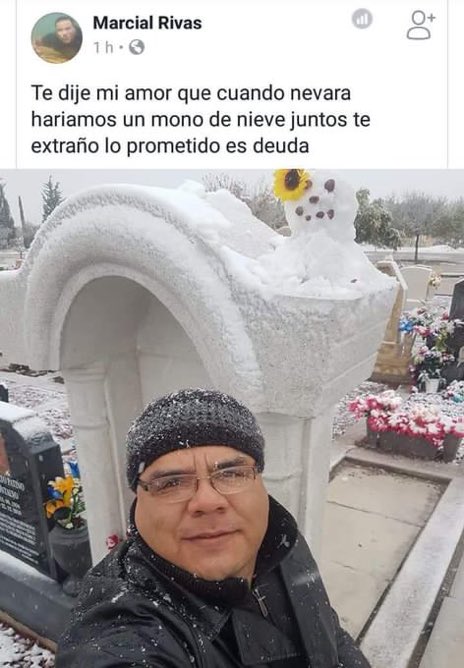 De acuerdo a la página de Jon de la Torre, donde la gente comparte paisajes y momentos de Coahuila, el hombre fue a montar un mono de nieve sobre el nicho de su amada y le colocó una flor artificial, desde donde se tomó una selfie.